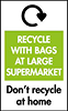 This label can be seen on plastic wrapping like bread bags, chocolate wrappers and crisps packets. This can be recycled and is collected at specialised collection points at your local supermarkets.